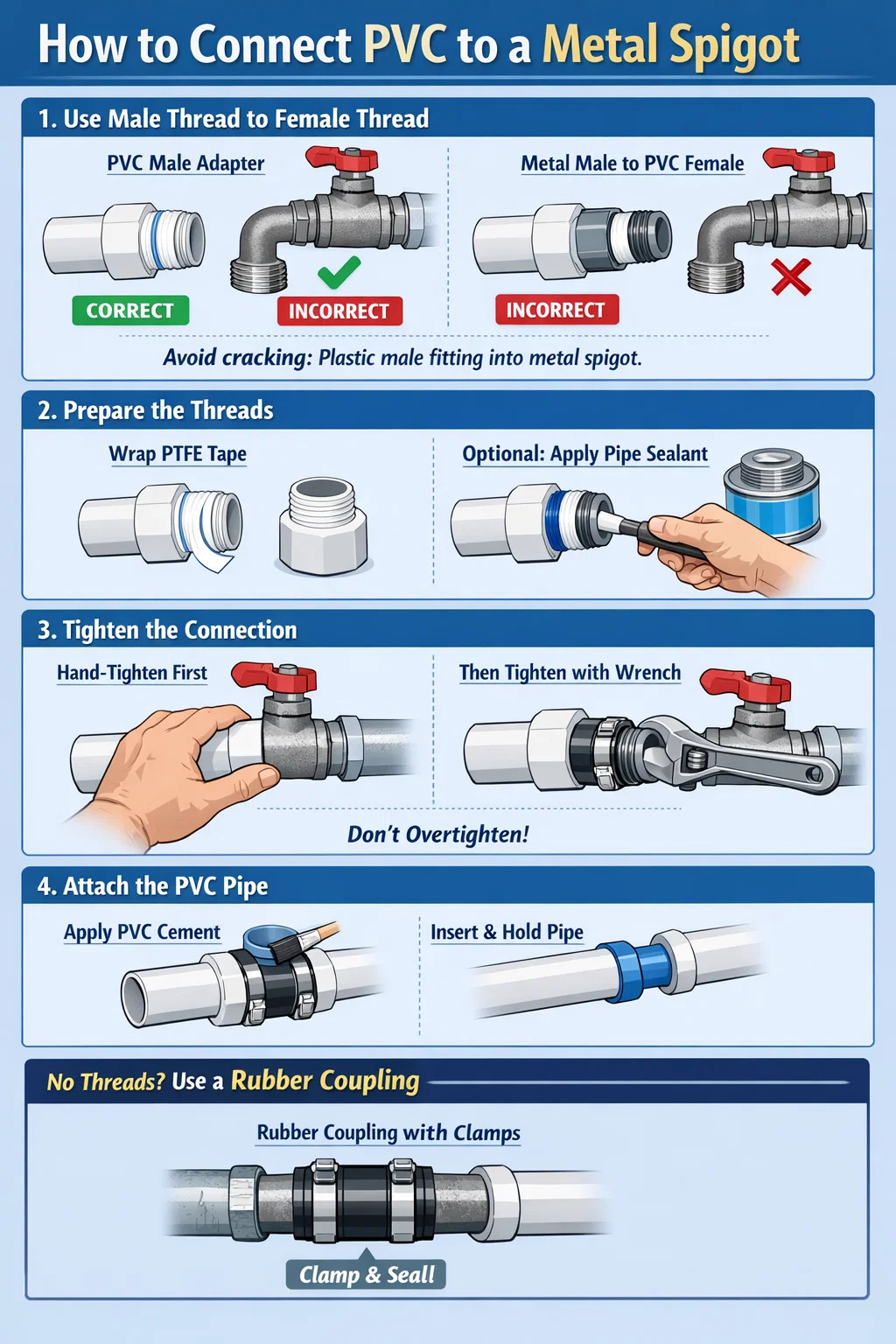 Het aansluiten van PVC-buizen op een metalen kraan (metalen kraan of klep) is een veel voorkomende taak bij reparaties aan sanitair in huis. Vanwege de verschillende hardheden en thermische uitzettings-/krimpsnelheden van kunststof en metaal, is tijdens het aansluiten speciale zorg nodig om lekken of gescheurde fittingen te voorkomen.