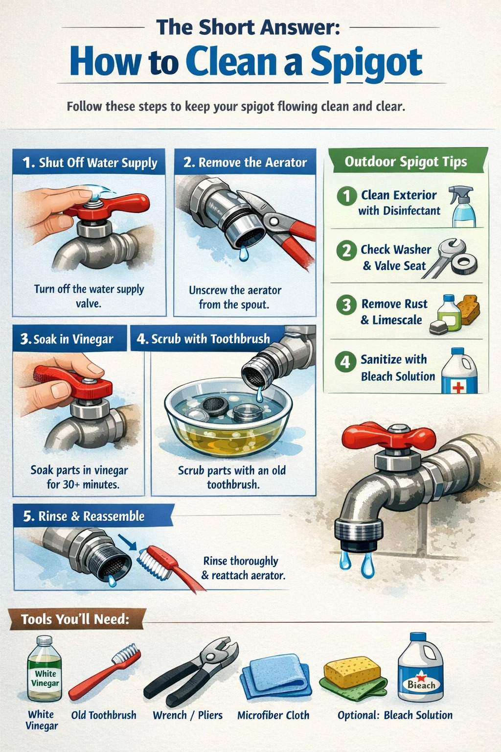 Deze gids behandelt alles: het gereedschap dat u nodig heeft, hoe u verschillende soorten kraanwerk reinigt, hoe u omgaat met hardnekkige minerale afzettingen, hoe u buitenkranen reinigt en hoe u uw kraan onderhoudt, zodat deze langer meegaat.
