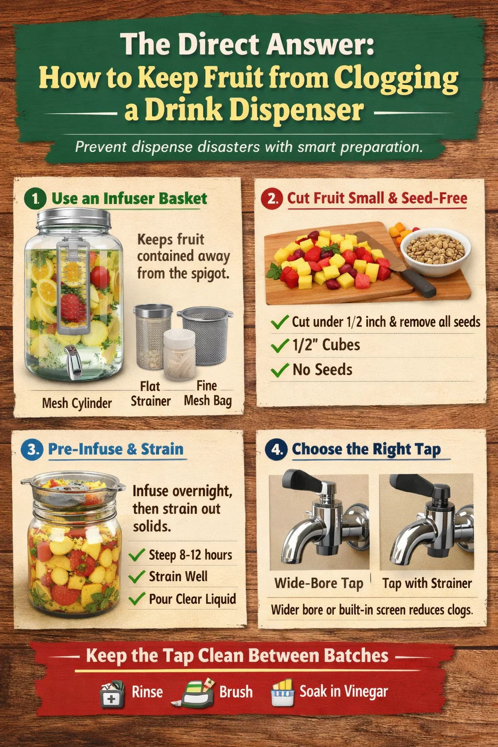 Een van de meest praktische benaderingen voor feesten, cateringevenementen of dagelijks gebruik is om de fruitsmaak vooraf in de vloeistof te laten trekken en vervolgens de vaste stoffen eruit te zeven voordat u deze in de dispenser giet. Deze methode geeft u maximale smaak zonder risico op verstopping.