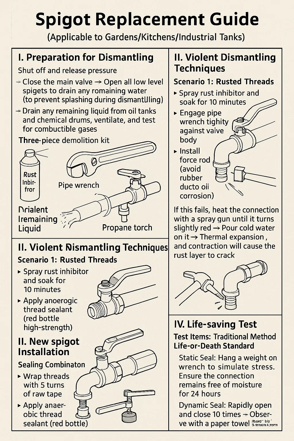 Sluit de hoofdklep → Open alle lage spigots om eventuele resterende water af te tappen (om spatten te voorkomen tijdens het ontmantelen)