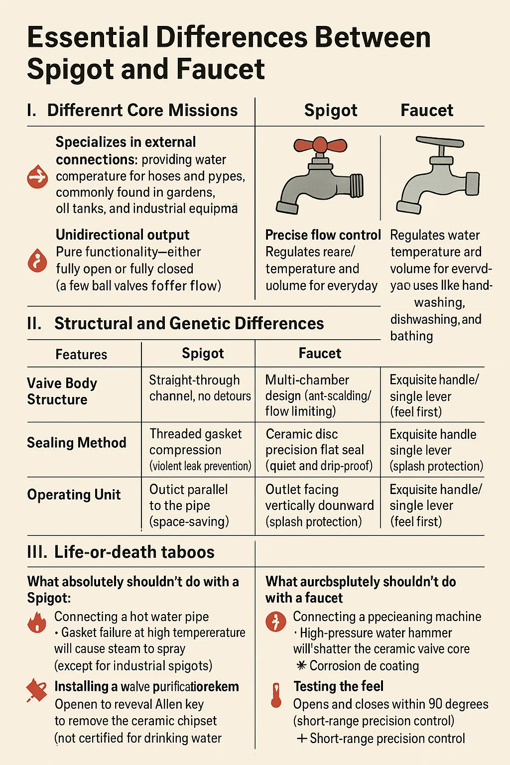 Wat je absoluut niet moet doen met een Spigot: Een warmwaterleiding aansluiten → Door een defecte pakking bij hoge temperaturen gaat er stoom spuiten (behalve bij industriële tappen) → Een waterzuiveringssysteem installeren → Neerslag van zware metalen (niet gecertificeerd voor drinkwater)